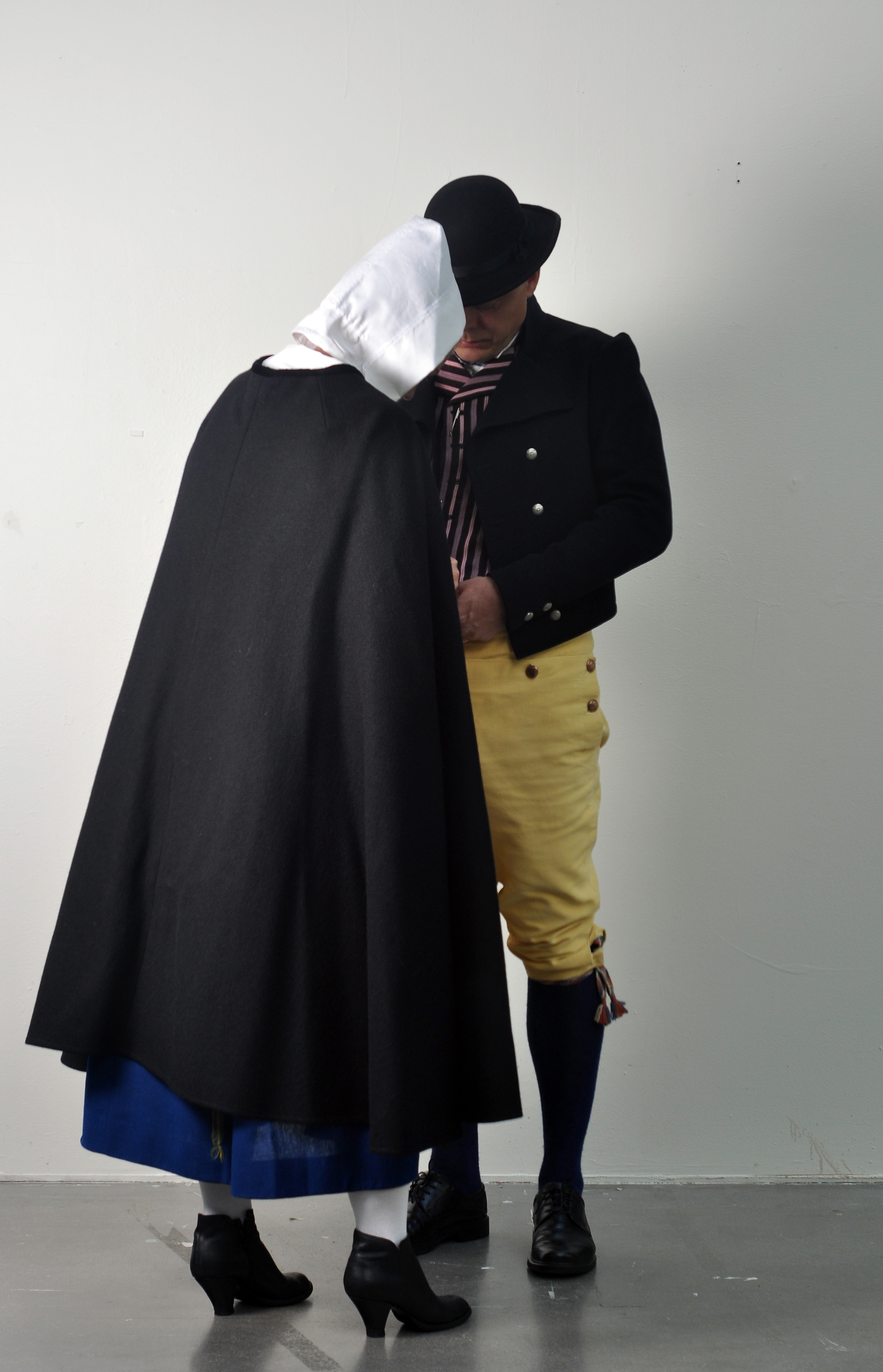 “Behind Platitudes and Strawberries” by Ulrika Gunnarsdotter Folk costumes and cultural heritage have become increasingly politicized. This was evident in the official opening of the Swedish Parliament in 2010, when the leader of the Sweden Democrats party, Jimmie Åkesson, wore a folk costume from Blekinge while his girlfriend, Louise Erixon, wore the Swedish national dress. The Sweden Democrats are a new party in Sweden with an controversial political platform. Sweden has had one of the most liberal immigration and refugee policies in the world, which has resulted in a significant immigrant population. Anti-immigrant sentiments have been on the rise throughout Europe and such tendencies have also been discovered in Sweden. Sweden Democrats were elected to Parliament with a tiny percentage of the vote on the basis of a clearly defined and strongly anti-immigrant agenda. The appropriation of the concept of “Swedishness” through the use of traditional folk dress created a maelstrom in the court of public opinion. Artist Ulrika Gunnarsdotter comments on this event and its political implications by renting and photographing herself and her partner in the very same costumes.